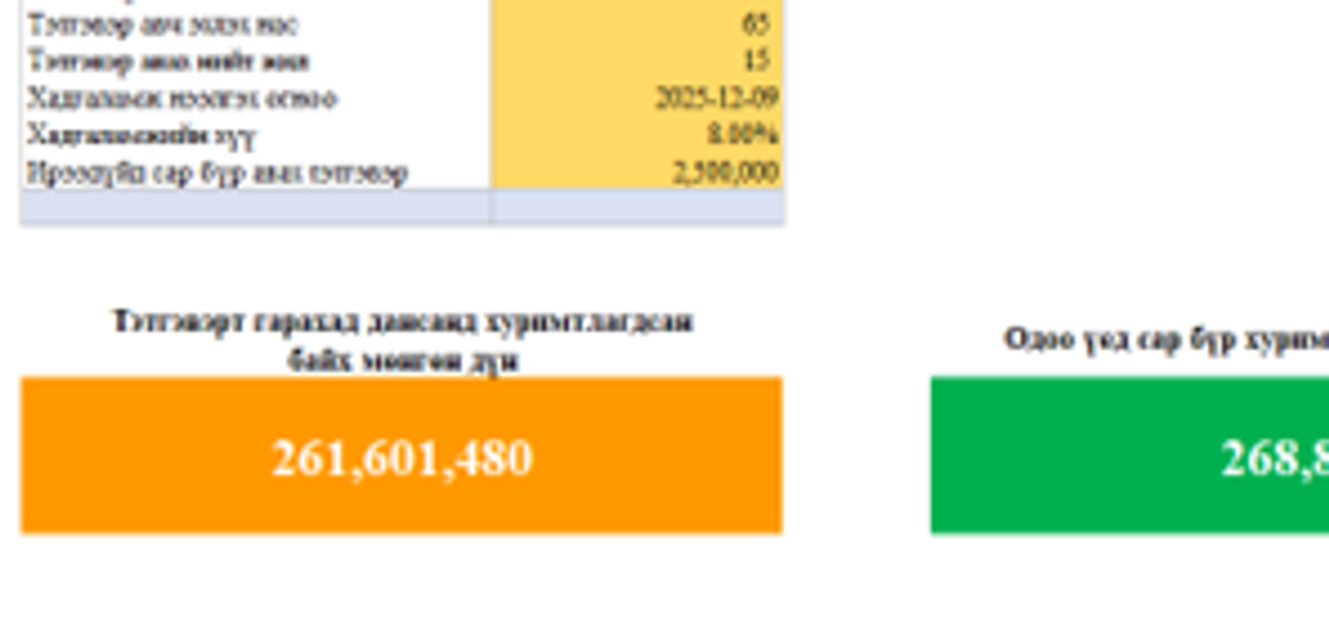 - ҮНДСЭН ТӨЛБӨРИЙГ СОНГОГДСОН САРУУДАД ХУВААН ТӨЛӨХ НӨХЦӨЛТЭЙ ЗЭЭЛИЙН ТООЦООЛОЛ