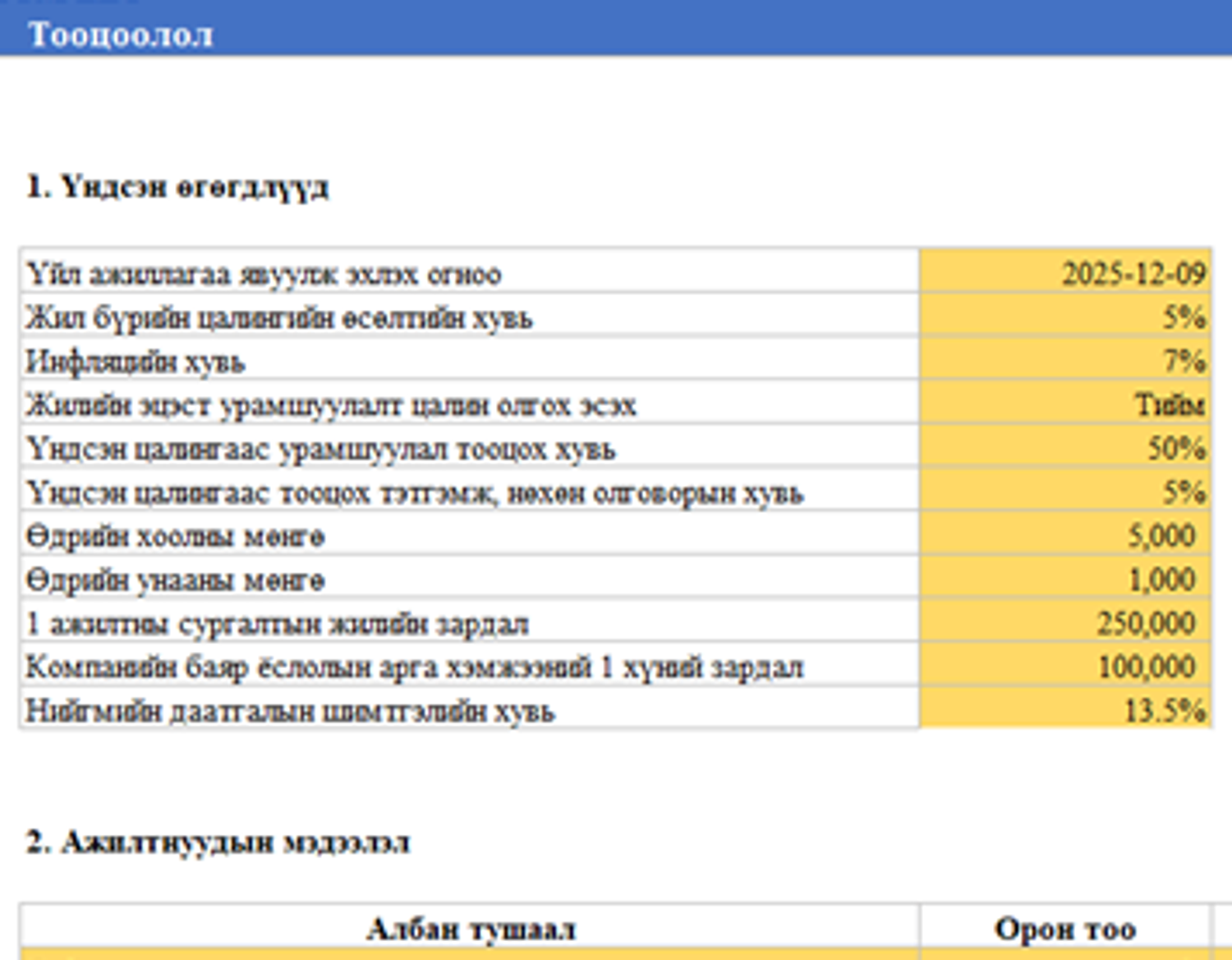 Санхүүгийн үйл ажиллагаатай холбоотой ажиллах хүчний, ашигт ажиллагаа, борлуулалт, мөнгөн гүйлгээ, хөрөнгө оруулалт, худалдан авалт, элэгдэл болон эрчим хүчний зардлыг тооцоолох зэрэг 35 загвараас та сонгон авах боломжтой.