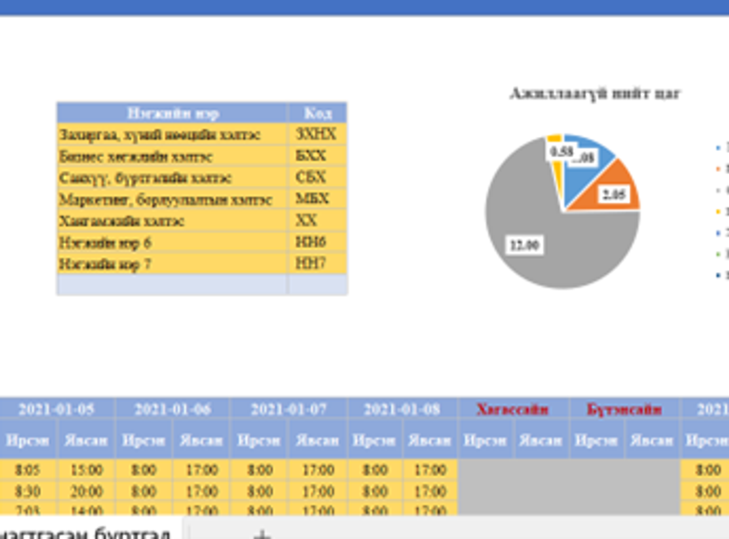 Энгийн цагийн хуваарийг дагаж мөрддөг компанид ажилладаг цаг бүртгэлийн программгүй хүний нөөцийн багийнханд зориулан цаг бүртгэлийн тооцоолол болон график бүхий загварыг боловсруулан хүргэж байна.