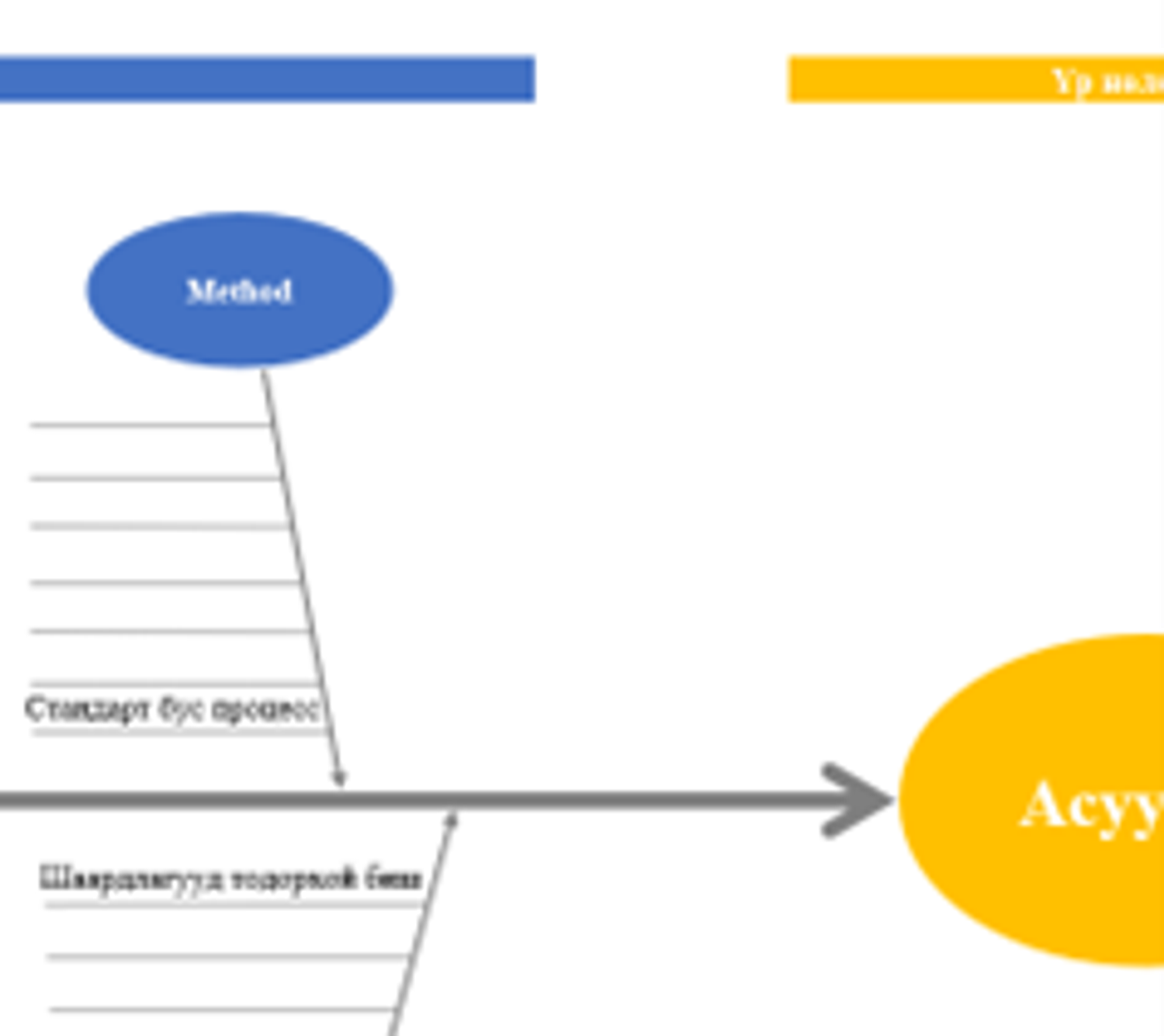 Паретогийн 80/20 зарчмыг ашиглан гаргасан, нэн тэргүүн ээлжид шийдвэрлэх шаардлагатай асуудлуудыг үүсгэж байгаа учир шалтгааныг “Fish bone” буюу “Загасан нуруу” загварын тусламжтайгаар тодорхойлох боломжтой.